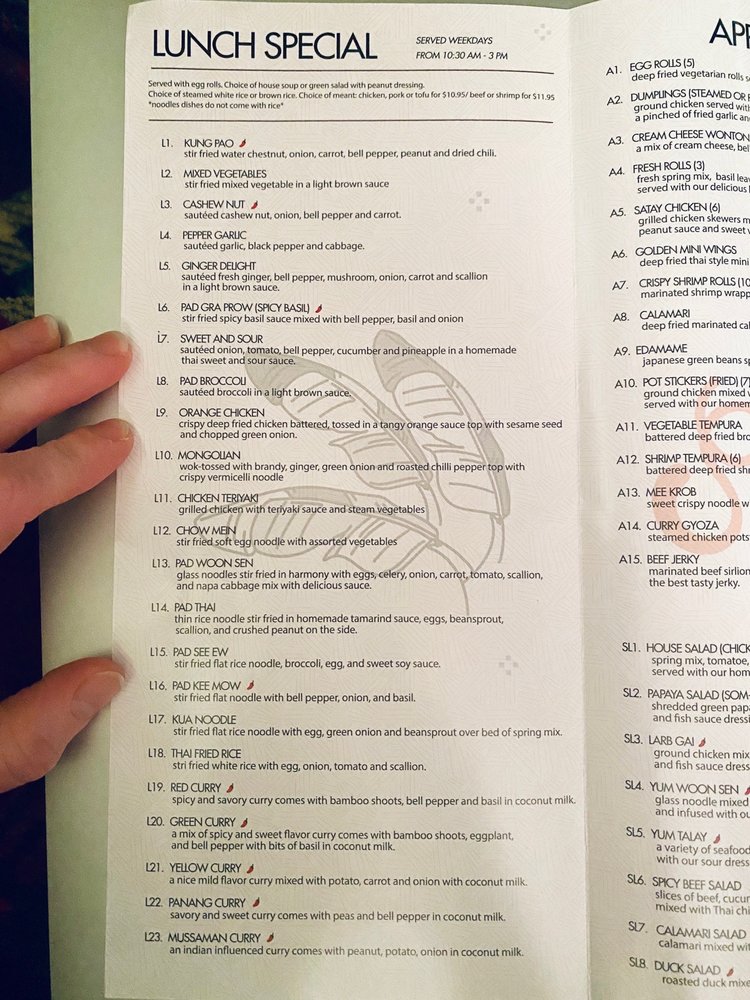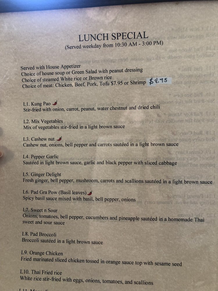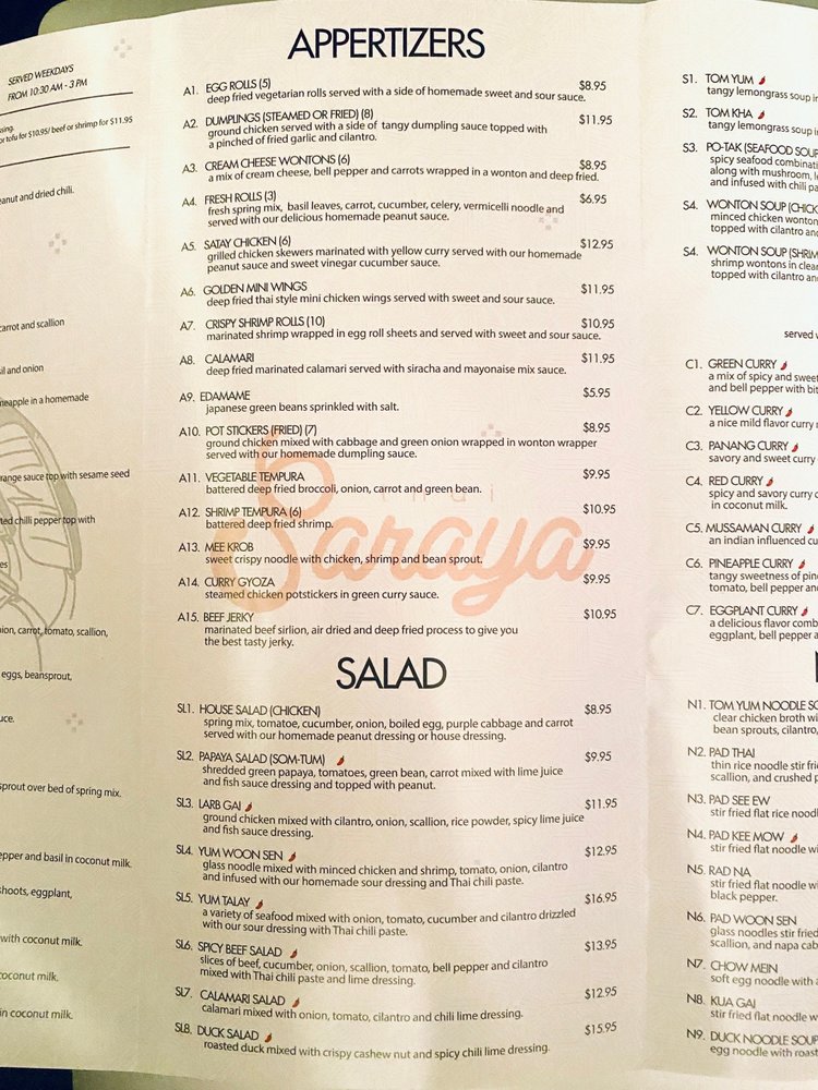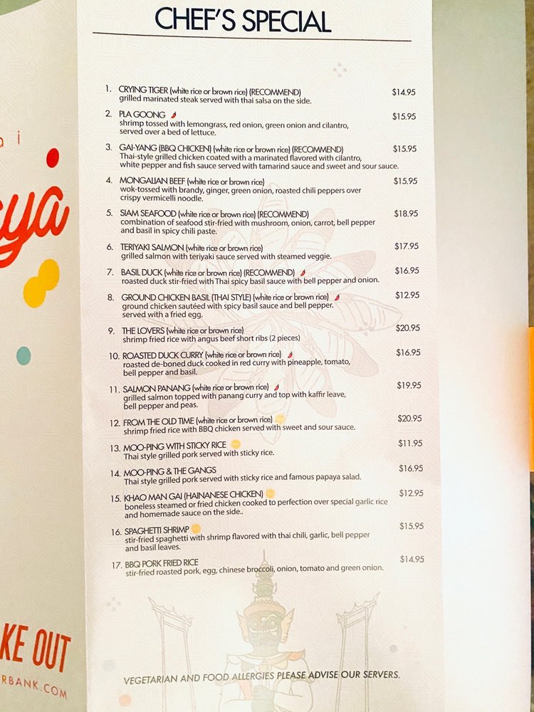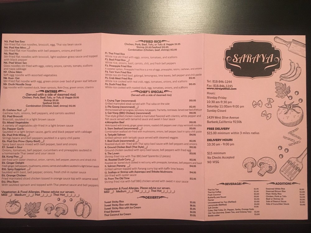 Introducing the menu at Saraya Thai Cuisine in Burbank, CA offers a diverse selection of Thai and Asian fusion dishes. With a focus on providing exceptional service, the restaurant caters to various dietary preferences, including vegan and vegetarian options. The menu features a range of appetizers such as crispy shrimp rolls, golden mini wings, and fresh rolls, each prepared with authentic flavors and quality ingredients. The restaurant's specialty soups like Tom Yum and Po-Tak seafood soup showcase bold and tangy flavors that are sure to satisfy. Customers rave about the flavorful dishes, from the Tom Kah soup to the pad thai and curry options. The restaurant's cozy atmosphere and friendly staff create a welcoming dining experience, making it a top choice for Thai cuisine enthusiasts. So, if you're in the mood for delicious Thai dishes with great service, Saraya Thai Cuisine is the place to visit.